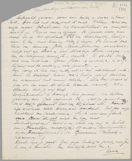 Hoe lang ik hier nog zitten zal is mij absoluut onbekend. Ik sukkel maar zoo'n beetje voort. Het kan me allemaal weinig schelen. Elke dag spreek ik pas om zes uur de eerste levende mensch. Het is ellendig, dat jij weg bent.