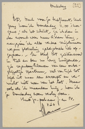 Dank voor je briefkaart. Heel graag kom ik Donderdag 11.00 uur 's morgens; als het schikt, ga ik dan in den avond weer naar A'dam terug, aangezien ik alle verdere reisplannen wegens plotseling geldgebrek heb opgegeven. - Ik bleef tot gisterenavond in Tiel en ben nu hevig knijpende, zie regenboogkleuren van een onbegrijpelijk spectrum, val van tijd tot tijd uit naar een excerpt en verwacht niets meer van het lot. Maar ook als ik maanden krijg, kom ik je Donderdag even verslag doen.