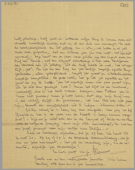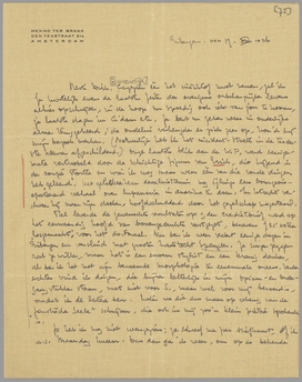 Aangezien één het initiatief moet nemen, zal ik je kostelijk even de laatste feiten des overigens onbelangrijken levens alhier opschrijven, in de hoop nu spoedig ook iets van jou te hooren, je laatste dagen in A’dam etc. Je bent nu zeker weer in ouderlijke armen teruggekeerd; de oudelui verheugden er zich zeer op, kon ik bij mijn bezoek merken. (Natuurlijk heb ik het incident-Stoett in de teederste kleuren afgeschilderd.) Onze laatste blik aan de W.P. werd eenigermate vertroebeld door de schichtige figuur van Erich, die hijgend in de coupé stortte en wien ik nog maar weer één van die ronde dingen heb ‘geleend’. Het gelukte hem desalniettemin nog ijlings een bourgeois-epateerend verhaal over lupanaria in Amerika te doen. In Utrecht verdween hij naar zijn doeken, hoofdschuddend door het gezelschap nagestaard.