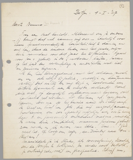 Ik ben hier teruggekeerd met het voldane gevoel van een, als altijd bij jullie, vroolijk en aangenaam verblijf dat achter den rug ligt en zoodoende een bittere bijsmaak aan de vreugde verleent. Want wie weet, of dergelijk onbekommerd logeeren ooit herhaald zal worden. Er bestaan namelijk zeer goede kansen voor me op het banio aan De Telegraaf. Ik kreeg een brief van Jobs die mij verzocht, namens Arntzenius om zoo spoedig mogelijk even over te komen, daar A. een persoonlijk onderhoud met me wenschte. Er waren drie candidaten waarmee serieus geluld zou worden en één ervan was ikke. Dus...? God weet het. Op hoop van zegen, a.s. Dinsdag naar Amsterdam!