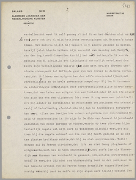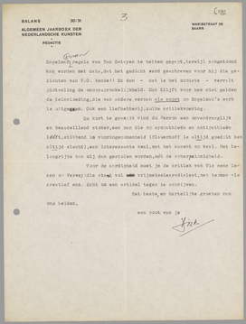 Verder: je schreef bij du Perron te zijn geweest, en eens een samenkomst te willen arrangeeren ter bespreking van de wederom brandende kwestie der kunst. Welnu, ik wil je vast vooraf zeggen, dat ik pertinent ongenegen ben dezen heer te ontmoeten, niet uit vrees voor een debat, maar omdat hij blijk gegeven heeft een zoo intrigant en kwaadaardig individu te zijn (althans hij gedraagt zich jegens mij zoo), dat ik bezwaarlijk lust kan koesteren te genieten van zijn scherpzinnigheid. Deze querulant heeft, naar ik bemerk, een onuitsprekelijke verachting voor mij, die mij werkelijk verhindert hem de blamage van een ontmoeting aan te doen. De oorzaak dezer verregaande weerzin voedt hij door het lezen van mijn verzen en kritieken, die - ook de laatste - zoo minderwaardig moeten zijn van oorspronkelijkheid en gebrek aan karakter of persoonlijkheid, dat zijn Hooge Ziel deerlijk door een kennismaking met den drager dezer leegte zal worden geschokt.