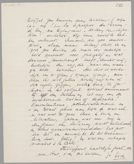 Ik maak wel mijn excuses voor mijn (door overhaasting ontstane) slordigheid, om in ‘Het Portret’ een fout te laten zitten, die mijn kennis van het Nederlandsch in twijfel zou kunnen doen trekken (mijn i.p.v. mij!). - En à propos du Perron: ik ben, na lezing van ‘Written in dejection’ werkelijk blij hem nooit te hebben ontmoet. Iemand, die zoo autistisch alleen maar belang stelt in en zich zoo buiten de mate der redelijkheid opwindt voor zichzelf en wat daarmee samenhangt heeft, dunkt mij, duidelijk den weg, die naar den waanzin leidt, betreden. Het slot is werkelijk om te gillen; tjonge, tjonge, menschen ik wil jullie hierbij nog even in drie regels zeggen, welk boek ik ga lezen. In het volgend artikel annonceert hij den datum en het uur van de eerstkomende coïtus of defecatie! Querulantisme, polemisatiemanie en een totaal gebrek aan kijk op wat wel en wat niet ter zake doet in leven en litteratuur, ziedaar wat voor mij in den figuur van du Perron wordt belichaamd, en tevens gecaricaturiseerd door het feit dat het een mensch is die dit lichaam leven doet. Zielig! En wat een verkapte moralist à la Coster!
