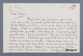 Als jij niet naar Griet gaat, ga ik ook niet naar Griet. (variant op het bekende bruiloftslied) Ik ben Zaterdagavond vrij, kom met de trein van 5.07 uit Leiden. 'k Zal m'n embleem van ‘Kerk en Vrede’ meenemen, nl. de ‘gebroken geweertjes’. 'k Ben benieuwd, 't zal me een gekijf en gekakel wezen. Kom je me afhalen? Eten we in de Bijenkorf of à la maison. 'k Zat vanmorgen met Pa de Roos in de tram, we hadden een aardige conversatie. Bel me morgen maar eens even op als je in den Haag bent. 'k Ben na vieren steeds thuis, werk aan hèt plan. We(e)ken is nieuwe spelling, 't heeft zoo'n weeke klank en zoo lang. Schoolmeester! toch een leuke vent.
