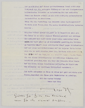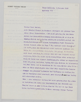 mein baseler Freund Dr.Bruckner - übrigens ein grosser Verehrer Ihrer Dissertation - hat mich gebeten, ihm das Manuskript der Karnevalübertragung zuzuschicken, da er es an Rascher-Zürich weiterleiten möchte. Er unterhält, soviel ich weiss, Beziehungen zu diesem Verlagshaus. Steht Ihrerseits diesem Versuch etwas im Wege? Wie verhielt sich Cassirer? Ich hoffe, dass das Manuskript nicht verloren gegangen ist. Falls Sie einverstanden sind, werde ich meinen Durchschlag nach Basel schicken, Sie können dann mit dem Original weiter operieren, falls Sie nicht durch Misserfolge schon entmutigt sind. Ich weiss aus eigenen Bemühungen, wie schwer es augenblicklich ist, einen deutschen Verlag für neue Autoren zu interessieren. Dann hätte ich im Anschluss an die neue Aktion eine Bitte: wäre es ihnen möglich, mir eine oder zwei wesentliche Besprechungen des ‘Carnaval’ leihweise zur Verfügung zu stellen, die ich in Exzerpten oder eventuell ganz übersetzt dem Verlag mit einreichen möchte.