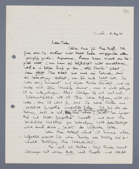 Schönen Dank für Ihnen Brief. Ich finde dass Sie durchaus nicht Recht haben mir gegenüber allzu grosszügig zu sein. Angenommen, Thomas Mann nimmt das Kapitel nicht (man kann die Möglichkeit nicht ausschliessen, weil er in letzter Linie zu den ‘alten Christen’ gehört), dann bleibt Ihre Arbeit und auch die Tatsache, dass die Uebersetzung vorliegt, was für mich Wert hat. Sie haben das ‘Karneval’ auf eigenes Risiko übersetzt, und ich mache mich öften Vorwürfe daraus, dass es nicht gelungen ist es unterzubringen. Also: überlegen Sie sich noch mal. Selbstverständlich will ich Ihnen meine Auffassung nicht einreden, denn ich weiss ja, dass Sie meine Bücher aus persönlicher Sympathie ausgewählt haben. Ich bin aber der Meinung, dass es sich, was die Bezahlung anbetrifft, um etwas ‘jenseits’ von Sympathie und nicht ‘Sympathie’ handelt, und dass Ihr persönliches Verhältnis zur Uebersetzung nicht beeinträchtigt wird durch dieses ‘Jenseits’ des verfluchten Geldes.