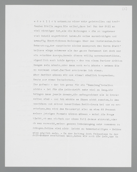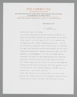 Ihr Aufsatz - den ich gerne für die ‘Sammlung’ behalten möchte - ist für die Zeitschrift sehr viel zu lang. Wir bringen kaum jemals Essays, die umfangreicher als 10 Druckseiten sind - und ich möchte es Ihnen nicht zumuten, in dem unschönen und schwer leserlichen Petit-Druck bei uns zu erscheinen. Man wird das Manuskript also um etwa 65 Prozent seines jetzigen Formats kürzen müssen - wobei die Frage bleibt, ob man einfach nur einen Teil daraus abdruckt, oder ob man versucht, seinen ganzen Gedankengang sehr zusammen zu drängen. Beides wird nicht leicht zu bewerkstelligen - Beides wird möglich sein. - Da der Beitrag doch frühestens in der Juli-Nummer erscheinen kann, haben wir noch die Zeit, uns im Haag über den heiklen Fall zu besprechen. Bis dahin wollen wir -denke ich - die endgültige Entscheidung vertragen. Lassen Sie mich nur jetzt schon wissen, wie Sie prinzipiell zu der Frage der Kürzung stehen.