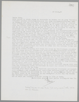 Mijn vulpen is sinds dagen in reparatie en daarom kan ik geen ‘vertrouwelijke’ brieven schrijven; excuseer dus mijn machineschrift. Dank voor je brief. Ik heb Bep niet meer gesproken of opgebeld, zooals je gehoord zult hebben; bijzonder nieuws had ik niet en ik dacht wel, dat zij het te druk zou hebben gehad om over te komen. Is nu de boel aan kant? Geluk met de plaatsing van één en ander! Ik hoop het in November te zien en inderdaad zoo weinig mogelijk de ‘zaken’ aan te roeren! Correctie van je voorrede kreeg ik nog niet, wel het reisexemplaar, zijnde band, omslag en eerste vel. Band is keurig, papier uitstekend, omslag niet onaardig. Zijlstra maakt 10 ex. op japansch, waarvan jij er natuurlijk ook één krijgt, met vier gewone erbij. Alles bij elkaar wel weer een ‘gek’ boekje. De carissimus frater, aan wien het is opgedragen, komt vanmiddag hier, beladen met het manuscript van en zijn critiek op Dr. Dumay.
