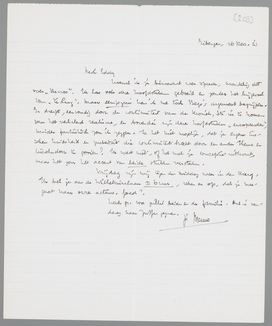 Hoewel ik je binnenkort weer spreek, mondeling dit over Ducroo. Ik las ook deze hoofdstukken geboeid en zonder het bijgevoel van ‘te lang’. Maar eenigszins kan ik me toch Bep's argument begrijpen. Er dreigt, eenvoudig door de continuïteit van de kroniek, iets in te komen van het verhalend realisme, en bovendien zijn deze hoofdstukken ‘europeescher’, minder fantastisch zou ik zeggen. Is het niet mogelijk, dat je ergens tusschen kindsheid en puberteit die continuïteit breekt door een ander thema er tusschendoor te gooien? Ik weet niet, of het met je conceptie uitkomt, maar het zou het accent van beide stukken versterken.