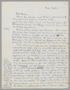 Met die vertaling is het ook een rare kwestie: misschien heeft L. nl. zijn eigen kanalen hier in Parijs en verdomt hij het om het via ons te doen. Dit is volstrekt niet uitgesloten, gegeven zijn communisme. Ik kan feitelijk dus niets doen, dan hier en daar informeeren, tot ik van jou weet hoe het met L. staat, wat jullie in Holland verder besloten of gedaan hebben, enz. Als je zelf geen tijd hebt, vraag Ant dus om mij te schrijven wat er gaande is.