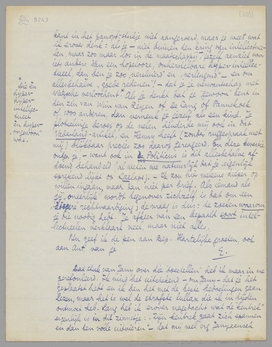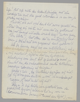Dat stuk van Jany over die ‘toestellen’ heb ik maar in me gerefouleerd. Ik vind het uitstekend - om Jany - dat je het geplaatst hebt en ik ben het met de beste bedoelingen gaan lezen, maar het is wel de strafste lullax die ik in tijden ontmoet heb. Lang heb ik erover nagedacht wat de ‘kentrek’ eigenlijk is in dit zinnetje ‘Zijn kentrek gaat zich spannen en dan ten volle uitvieren’ - dat mij wel erg Janyaansch voorkomt, maar dat ik misschien toch te lichtvaardig vereenzelvig met den ‘geschoren gorgel’ van Persius. Hoe het zij, als je bedenkt dat dit proza misschien de sublimeering is van wat Jany's kentrek - zal ik maar zeggen - in ‘gewonere’ dagen elders placht uit te gieten, dan kan ik mij weer voorstellen dat je het dierlijke boven het intellectueele gaat verkiezen!