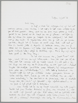 Je brief in dank hier ontvangen. Wij zijn hier met noodweer gekomen, maar vandaag is het mooi; ik heb onder invloed van de zon al hard gewerkt. Henny zond een paar dagen geleden je brief, zoodat ik nu precies op de hoogte ben van je plannen. Het lijkt me alles bij elkaar (en gegeven je scepsis op den achtergrond) het beste wat je doen kunt. De mogelijkheden daar ken je niet, en ze kunnen meevallen, terwijl het in Europa de eerste jaren toch niet veel gedaan is. Mochten jullie in Augustus in Holland komen, dan kun je altijd bij ons logeeren. Wij hebben drie bedden, die (afgezien van buitengewone omstandigheden) altijd ter beschikking zijn. Na 6 Aug. zijn wij in ieder geval in den Haag terug.