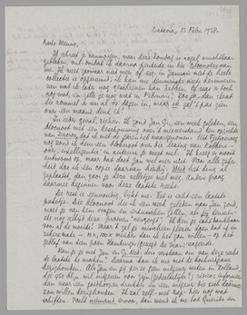 Ik schreef je vanmorgen, maar deze Zondag is nogal vruchtbaar gebleken, vnl. omdat ik daarna peuterde in die Blocnotes van me. Ik weet zoowaar niet meer of eig. in Januari niet de heele collectie is opgeruimd; ik kan me tenminste niets herinneren van wat ik later nog geschreven kan hebben. Of was er toch nog wat, en zette je nog wat in Februari? Zoo ja, dan staat die rommel er nu al 14 dagen in, maar ik zal 't pas zien over een maand, denk ik!