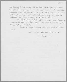 Las je het na-stukje van Jos. de Gruyter in Het Vad. van Maandag? Het schijnt, dat ook deze overigens zoo respectabele man zoo plotseling aangegrepen is door de angst voor het nat. socialisme, geformuleerd als ‘objectiviteit’. Ik vind zooiets bepaald een naargeestig schouwspel. Welk recht heeft zoo'n man nog, om de ‘scribenten’ van Volk & Vaderland de les te lezen!