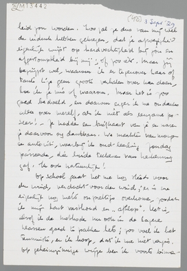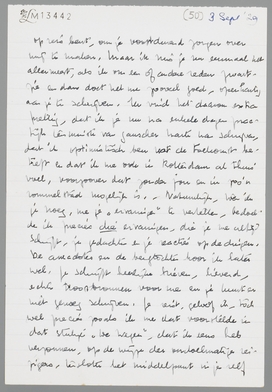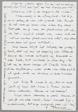 Ik heb me er na je eerste brief van 5 september wel een beetje een verwijt van gemaakt, dat ik al mijn voorbijgaande melancholieën maar jou klakkeloos aan je schreef, terwijl je toch niet op reis bent, om je voortdurend zorgen over mij te maken. Maar ik mis je nu eenmaal het allermeest, als ik om een of andere reden zwart zie en dan doet het me zooveel goed, openhartig aan je te schrijven. Ik vind het daarom extra onprettig, dat ik je nu na enkele dagen practijk tenminsten van ganscher harte kan schrijven, dat ik optimistisch ben wat de toekomst betreft en dat ik me ook in Rotterdam al thuis voel, voorzoover dat zonder jou en in zoo’n rommelstad mogelijk is. Natuurlijk, toen ik je vroeg, me je ‘ervaringen’ te vertellen, bedoelde ik precies die ervaringen, die je me altijd schrijft - je gedachten en je reacties op de dingen. De anecdotes en de bergtochten hoor ik later wel. Je schrijft heerlijke brieven, lieverd, echte troostbronnen voor me en je kunt er niet genoeg schrijven. Je reist, geloof ik, toch wel precies zooals ik me dat voorstelde in dat stukje ‘De Wegen’, dat ik eens heb verzonnen, op de wijze der ondoelmatige reizigers, tenslotte het middelpunt in je zelf zoekend en niet in de bergjes en de musea.
