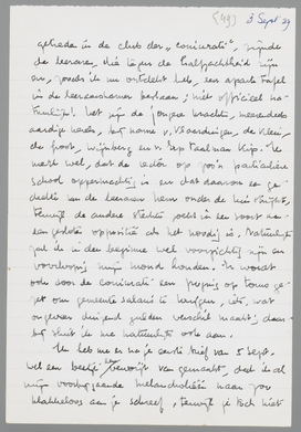 Vandaag ben ik maar in Tiel gaan weekenden, om op die manier meteen de uitgebreide belangstelling van de familie naar voorloopig nieuws te gaan bevredigen. Het is hier nog ‘als vanouds’; zelfs oom Nico is er nog en we voerden gisteren weer een zwaar debat over van alles en nog wat, (Hij heeft me zijn boekenkast aangeboden; zou ik die kunnen plaatsen, als ik de middelgroote - die ik nu heb links van de deur aan Wim gaf? Denk er eens over na!) Ook Jan en Aukje zijn er nog; Jan is weer dikker geworden en Aukje is geheel mama, spreekt over niets anders dan Liesje. Natuurlijk trachtte zij me in haar goedhartigheid bekentenissen over mijn eenzaamheid-zonder-jou af te zetten, maar daartoe kan ik met de beste wil niet overgaan. Het is me, alsof de eenzaamheid, die ik werkelijk voel, daardoor tot een soort commis-voyageurs eenzaamheid zou worden. Zoo zal ze dus van mij wel de indruk hebben gekregen, dat je afwezigheid eigenlijk wijst op hardvochtigheid bij jou en afgestomptheid bij mij; of zoo iets. Maar jij begrijpt wel, waarom ik er tegenover haar of Tante Lize geen groote verhalen over kan doen, hoe is je mis of waarom. Maar het is zoo goed bedoeld, en daarom erger ik me ondanks alles over mezelf, als ik niet als eenzame poseer! - Ze hadden een briefkaart van je en waren je daarvoor erg dankbaar. We maakten vanmorgen een autorit, waarbij ik oud-leerling Zondag passeerde, die luide teekenen van herkenning gaf. Ik ook natuurlijk!