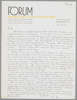 Eddy kwam met een plan voor uitgave in brochure vorm van essays en novellen (dus als overdruk) in navolging van buitenlandsche tijdschriften. Ik vind het idee wel aardig maar zie er toch zakelijk weinig in, de Hollander is (je constateerde het indertijd in je Bijenkorf-causerie) te weinig op bezit van boeken gesteld. Mij komt het voor dat karakter en peil van de stukken die voor zoo'n uitgave in aanmerking komen het debiet toch beperken tot de lezers van Forum en voor die is zij m.i. weer overbodig.