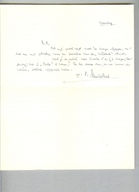 Voel je er echter voor tusschen 5 en ½ 6 morgen (Donderdag) even in ‘Riche’ te komen? Ik ben daar dan, en we kunnen een nieuwe, soliede afspraak maken.