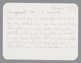 Veel dank voor de vriendelijke toezending van Uw kritiek en nog meer voor de ernstige belangstelling in mijn werk. Dat U deze gedachtenwisseling op het gehalte van Vondels en mijn Kerk toespitst lijkt me volkomen redelijk, zoals het me ook voldoening geeft dat U het intellect aan het woord laat komen. Uw zwaard gaat door de huid van gevoeligheden en het vlees van dierbaarheden tot op het been van beginselen. Zo moet het onder mannen gebeuren. Alleen is het teleurstellend, hoe U nog zo instinctief werkt om ‘temperament’ met geest te verwarren, en, o vrije vitalist!, Uw individueel oordeel door vooroordelen van de massa te laten verdringen. Zou de poort, waarmee U het Katholicisme buiten de wereld sluit, niet feitelijk de oogklep zijn waarmee u zich zelf isoleert? Ik beveel U bij gelegenheid een studie als Fr. W. Foerster's Autorität und Freiheit aan en breng U het persoonlijk ‘I’ in de boeken van J.H. Neuman in herinnering. Een ridderlijk saluut!