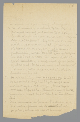 | 1. | In het mondeling onderhoud, dat ik, tijdens Uw bezoek aan mij, met den heer v/dH. had, bracht hij de kwestie van een geldelijke vergoeding wel ter sprake. Wij kwamen overeen, dat ik U zou meedelen, dat hij bereid was de brieven zonder vergoeding af te staan ter publicatie, indien deze publicatie U geen geldelijk voordeel opbracht. In 't tegenovergestelde geval maakte hij aanspraak op een deel v/h evt. voordeel. Welk deel werd niet vastgesteld. Ik meen, dat ik in deze geest U ook het bericht overbracht. |