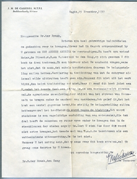 Brieven zyn heel gebrekkige hulpmiddelen om gedachten over te brengen. Liever had ik dan ook morgenochtend by U gekomen om HET ANDERE AMERIKA te overhandigen. Nu heeft myn vriend Meier, de Direct. v. B. en W. toezicht te den Haag, op zich genomen U dit boek te doen toekomen. Ik zou hiervoor niet Uw aandacht vragen, ware het niet, dat ik meen, dat enkele hoofdstukken daarvan Uw belangstelling zullen hebben. Verklaring en toelichting van wat de schryver allemaal wilde uitdrukken heeft geen zin. Waneer dit niet uit het werk blykt, dan helpt toelichting ook niet. Maar ik zend dit boek juist aan U, omdat het tweede deel een poging is, om een maatschappelyk streven nml. De agrarische samenleving, door middel van het streven van Roosevelt te brengen onder de aandacht van meerderen. Ook geloof ik, dat het boek een aantal gegevens bevat, die stellig Uw belangstelling zullen hebben: vooral het hoofdstuk: de stryd tegen de blabitis. Het woord stedebouw is een ongelukkige aanduiding van een wetenschap, die ten doel heeft de menschen op ruimer wyze onder te brengen dan in de steenklompen der steden mogelyk is. Laat U zich dus door dit woord niet ertoe brengen, het tweede deel van H.a.A. te beschouwen als een vaktechnische uiteenzetting. Dat is het niet.