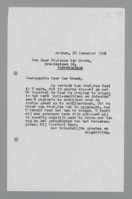 Op verzoek van Prof. Pos deel ik u mede, dat ik gaarne accoord ga met uw voorstel de Heer de Gruyter te vragen in het werk ‘Anti-semitisme en Jodendom’ een 8 pagina's te schrijven over de Joodse geest en de schilderkunst. Uit de brief van Prof. Pos heb ik opgemaakt, dat U bereid bent het hem te vragen. U zoudt mij een genoegen doen zijn antwoord mij zo spoedig mogelijk mede te delen met het oog op het gereedmaken van het reisexemplaar. Bij voorbaat dank.