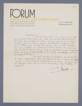tot mijn spijt moet ik je nog eens met het stuk over de Meester lastig vallen. Wij hebben n.l. nu alle drie (d.P., R. en ik) het artikel grondig gelezen en hebben, mede in verband met het bijna onmogelijke werk om over 64 pagina's een behoorlijk verdeeld nummer samen te stellen, er de conclusie uit getrokken, dat de eerste bladzijden als te zeer ‘gesproken’ o.i. gemist zouden kunnen worden. Pas bij de passage over de kunstrubriek kom je op de M. zelf terecht en juist die passage zouden wij graag als inzet plaatsen. (Ik heb bij het betreffende punt een kruis gezet, met inkt).