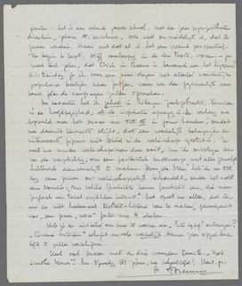 Ik ga n.l. tijdelijk lesgeven aan de 4e H.B.S. 5 j-cursus aan de Jozef Israëlskade 45, Amsterdam. Een betrekking van 25 uur, Nederl. en Geschied., met groote klassen, waar ik dus wel wat energie in mag steken, om niet te vergaan. Er zijn enkele lichtpunten: het is een erkend goede school, met een zeer sympathieke directeur, zekere A. Verschuur. Ook niet onvriendelijk is, dat ik zwaar verdien. Maar met dat al is het een vreemd perspectief. Ik begin 6 Sept., blijf voorloopig in de Den Texstr. wonen. - Je weet toch zeker, dat Dick in Baarn is benoemd aan het Lyceum? A.s. Dinsdag ga ik voor een paar dagen met allerlei wonderlijke populaire boekjes naar Zutfen, waar we dan gezamenlijk een soort plan de campagne zullen opmaken.