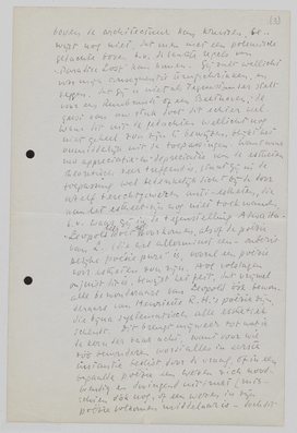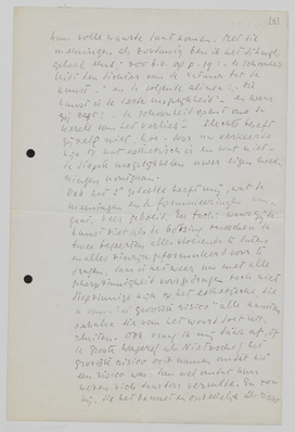 Ik heb wel zeer ‘at random’ enkele bezwaren opgegeven, die ik voelde bij het lezen van uw essay, en die minder uit verschil van meening voortkomen dan wel uit de overtuiging, dat gij, door de wijze waarop gij u instelt, uw eigen meeningen niet altijd tot hun volle waarde laat komen. Met die meeningen als zoodanig ben ik het dikwijls geheel eens; zoo b.v. op p. 19: ‘de schoonheid leidt den dichter van de natuur tot de kunst’ - en de volgende alinea: ‘die kunst is de derde mogelijkheid’ - en waar gij zegt: ‘de schoonheid opent ons de wereld van het verlies’. Slechts beseft gijzelf niet, hoe - door uw verkeerde kijk op wat esthetisch is en wat niet - de diepste mogelijkheden uwer eigen meeningen u ontgaan.