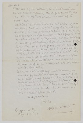 In Bergen is Augustus - voor mij althans - geen geschikte maand, om u mijn gevoelens en mijn meening over uw essay te schrijven zoo als ik dat zou willen. Ik hoop echter, dat ik eens de gelegenheid zal krijgen mij over deze dingen mondeling met u te onderhouden, wat toch altijd tot vollediger gedachtenwisseling leidt.