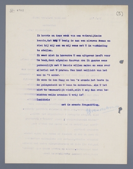 Onlangs correspondeerde ik met U over Uw laatste boek, dat mij zooveel aan nieuwe waarden gegeven heeft. Nu kom ik echter in een heel ander verband tot U. Ik ben namelijk in het dagelijksch leven uitgever van beroep en maak deel uit der Firma W. de Haan te Utrecht. De oude Heer de Haan heeft zich vroeger voornamelijk bezig gehouden met het uitgeven van kinderboeken, waarmee hij zich o.a. door het pousseeren van het werk van Rie Cramer, een groote bekendheid verworven heeft. De jonge Heer de Haan en ik willen echter, vooral nu we het heele kinderfonds verleden jaar verkocht hebben, een meer literaire richting uitgaan. Onze jongste uitgaven: vertalingen van Döblin, Berlin Alexanderplatz; Zweig Fouché; Ehrenburg Steeg a.d. Moskwa en het Leven der Auto's etc. getuigen daarvan.
