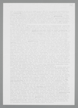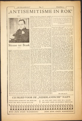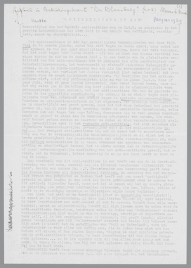 Reeds het feit dat de heer Zwaardemaker een terugkeer van de democratie zoo volkomen denkbeeldig acht, zegt een en ander over zijn ware gezindheid, aangezien hij toch wel kon weten, dat de oppositie in Duitschland, hoe chaotisch en ongeorganiseerd ook, met den dag toeneemt. Maar goed, wij gunnen hem deze overtuiging; fraaier is het, dat hij een aperte leugen, n.l. ‘de algemeene vereenzelviging in Duitschland van elk Joodsch streven met het Marxisme’, tot uitgangspunt kiest voor de schitterende oplossingen van het Joodsche vraagstuk die hij ons aan de hand gaat doen. Om een leugen in bescherming te nemen, ontzegt hij het Nederlandsche volk het recht te protesteeren tegen de progroms; en een dergelijke hypocrieten-moraal zou niet misdadig zijn voor het ‘eigen Vaderland’? Het wil mij voorkomen, dat geen actie het Nederlandsche volk meer kan schaden dan het prediken van dergelijke consideratie ten opzichte van de leuze, die door een geraffineerde propaganda aan een ander volk is opgedrongen, en die ons straks ook zal worden opgedrongen wanneer wij niet nauwkeurig acht slaan op het drijven der heele en halve leugenprofeten, in hemd of in rok. Alles is beter dan de consideratie jegens den leugen; en het waardige, ernstige en objectieve standpunt van den heer Zwaardemaker kan men zonder meer herleiden tot angst voor de overmacht, gecamoufleerd als oplossing van het Joodsche vraagstuk. Dat de heer Zwaardemaker bang is voor den Oostelijken buurman kan men zich zeer goed voorstellen, maar dat hij die angst afreageert in een even simplistisch als hypocriet betoog tegen de Joden, staat hem minder fraai. Vooral de aandoenlijke passage over de Joden in Duitschland die protestacties aan den lijve moeten voelen, is een staaltje van ‘gevoel’ waaraan men niet zonder weerzin voorbijgaat. Hoe echt dit medelijden van den gerokten antisemiet met de Joden is, kan men wel afleiden uit de bedoelingen, die hij hun rasgenooten in de emigratie toeschrijft:
