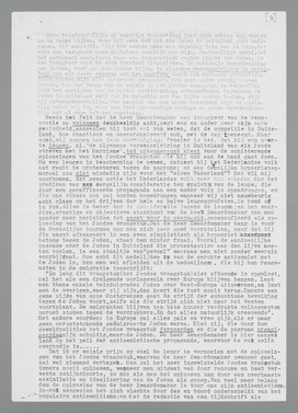 Onze voortreffelijke en waardige theoreticus laat zich echter nog verder in de kaart kijken, waar hij over het lot der Joden in Duitschland gaat mediteeren. Hij schrift: ‘Bij het zoeken naar een regeling late men de kans, dat ooit een terugkeer naar Duitschland mogelijk zou zijn, denkbeeldige geval, dat het nationaal socialisme voor een democratisch regiem plaats zou maken, is een terugkeer naar den ouden toestand uitgesloten. De nationale bewustwording aan Duitsche, doch ook aan Joodsche zijde, de algemeene vereenzelviging in Duitschland van elk Joodsch streven met het Marxisme maakt dit volkomen onmogelijk. Juist daarom zijn alle daverende protesten, die geen ander gevolg kunnen hebben, dan het tempo van de crisis in het Joodsche vraagstuk te versnellen door het aanblazen van de Duitsche verbittering, onvruchtbaar. Tegenover de Joden in Duitschland zelf die de reactie aan den lijve moeten boeten, zijn zij onverantwoordelijk. Ten aanzien van ons eigen Vaderland zijn ze misdadig, omdat zij de, voor ons land broodnoodige rustige en goede verstandhouding met al onze naburen verstoren.’
