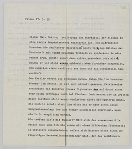 beiliegend den Fabrizius, der diesmal in eine rechte Barpantscherei ausgeartet ist. Und hoffentlich brauchen Sie den ‘Cröver Nacktarsch’ nicht von den Blicken der Kundschaft mit einem keuschen Tüchlein zu verdecken. Es wäre schade drum. Döblin kommt dann später gesondert oder mit Neuem; er ist nicht schlecht, aber furchtbar ausgewalzt. Und zuweilen elend verfizzt, was dann auf ein Geduldspiel hinausläuft.