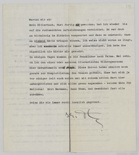 Den Kessler werden Sie bekommen haben. Haben Sie ihn brauchen können? Ich dachte, es sei sehr aktuell gewesen. Fatalerweise erscheinen die Memoiren dieses Diplomaten auf Grund eines sehr alten Vertrages noch bei Fischer. Doch werden sie im Dritten Reich bestimmt nicht warm, wenigstens nicht die späteren Bände, die noch in Arbeit sind. Zum Glück hat er aber schon einen Emigrantenverlag, der die Bücher automatisch übernimmt, wenn sie in D. verpfiffen werden.