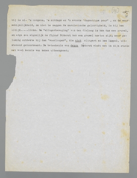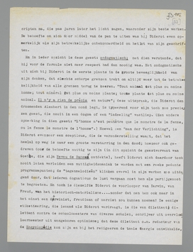 Een eigenaardig geval van achteruitzetting in Holland: het geval Diderot. Ten onzent weet men meer van Voltaire, Montesquieu en Rousseau, die minder ‘modern’ zijn, dan van Diderot, een geest, wiens beweeglijkheid, ongegeneerdheid, ijver, speelschheid, zakelijkheid en veelzijdigheid ons toch veel vertrouwder moesten voorkomen dan zelfs de Confessions van Jean Jacques. Een feit is, dat Diderot half en half werd doodgedrukt door zijn faam als encyclopaedie-redacteur, die niet een vijfde van zijn kwaliteiten weergeeft; want Diderot was allerminst het type van den rationalistischen voorlichter; hij was dat onder meer, maar voor alles was hij een der laatste groote dilettanten.