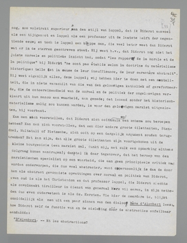 ooit op zulk een schema zou beroepen hebben? Kan men zich voorstellen, dat een dier andere groote dilettanten, Stendhal, Multatuli of Nietzsche, zich ooit op een dergelijk argument zouden terugtrekken? Het kan zijn, dat alle groote dilettanten zijn voortgekomen uit de kleine bourgeoisie (een marxist zal, dunkt mij, met zulk een opmerking althans dolgraag komen aandragen); dan stel ik daar tegenover, dat het beroep van den marxistischen specialist op een waarheid, die aan geen principieele critiek mag worden onderworpen, die dus veel abstracter, want onpersoonlijker is dan de door hem als abstract gevonniste opvattingen over moraal en politiek van Diderot, even oud is als het Christendom en dat professor Luppol, die Diderot slechts als onvolmaakt tirailleur in dienst van generaal Marx wil eeren, in zijn methoden dus even ouderwetsch is als ds. Kersten. Wie hier de meerdere is, blijkt onmiddellijk, als men uit een paar zinnen van den dialoog Rêve d'Alembert leest, hoe Diderot zelf de functie van en de misleiding dóór de abstracties onfeilbaar aanduidde: