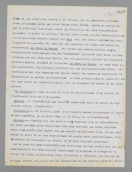 Aan de hand van deze voortreffelijke herleiding van het scepticisme tot een aangelegenheid van verschillende dogmatismen 's morgens, 's middags en 's avonds (te vinden in Entretien entre D'Alembert et Diderot), kan men ook begrijpen, waarom een Luppol van het scepticisme en den paradox niets wil weten: hij is nl. 's morgens, 's middags en 's avonds ‘dogmatique pour’, en de waarschijnlijkheid, om niet te zeggen de marxistische geloovigheid, is bij hem altijd... links. De ‘slingerbeweging’ van den dialoog is hem dus een gruwel, en ergo zou eigenlijk de figuur Diderot hem een gruwel moeten zijn; maar gelukkig ontdekte hij den ‘voorlooper’, die niet slingert en hem, Luppol, uitstekend gehoorzaamt. De beteekenis van dezen Diderot vindt men in zijn studie met veel kennis van zaken uiteengezet.