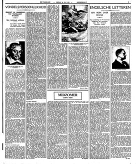 Ik heb hier slechts enkele punten van het Vondelprobleem en van de bijdrage daartoe door prof. Brom geleverd kunnen aanstippen. Brom behandelt veel meer kanten van Vondels persoonlijkheid: zijn verhouding tot Hugo de Groot, zijn tooneeldichterschap, zijn leerdichterschap, zijn functie als burger etc. etc.; hij is daarbij volstrekt niet oncritisch, waar het ondergeschikte kanten van Vondels wezen betreft; maar juist omdat hij ten opzichte van zijn eigenlijke onderwerp, Vondels geloof, niet critisch mag zijn, is zijn wel wat langademige, maar met kennis van zaken en veel smaak geschreven boek toch een monumentale bijdrage geworden, geinspireerd door een duidelijk omschreven levenshouding, en geen nieuwe verheerlijking in het wilde weg. Geen enkele niet-katholiek zal door Brom overtuigd worden; maar hij zal kunnen erkennen, dat de geloovige katholiek althans zijn reden heeft om Vondel als een figuur van groote beteekenis te beschouwen... zulks in onderscheid met de velen, die hardnekkig bij zijn dichterschap zweren en hem den volke aanbevelen als een soort ‘Universalgenie’.