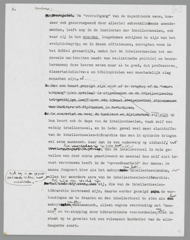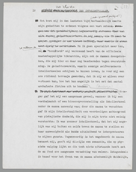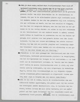 Maar in hoeverre is de intellectueel de man van zijn gedachten? Ik heb veel intellectueelen geobserveerd en de grootste gemeene deeler van mijn observaties is deze: De intellectueel is iemand, die pas in de allerlaatste plaats zijn toevlucht neemt tot denken; denken in de beteekenis van: gedachten bij zich toelaten, die men officieus al heeft, maar nog niet heeft durven formuleeren, omdat zij tegen het reeds geformuleerde indruischten. Men kan hem ranselen