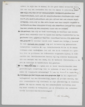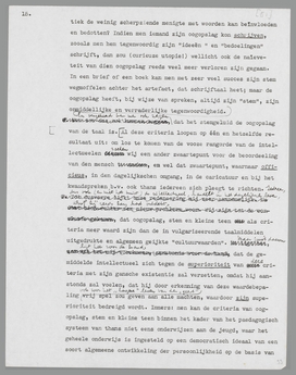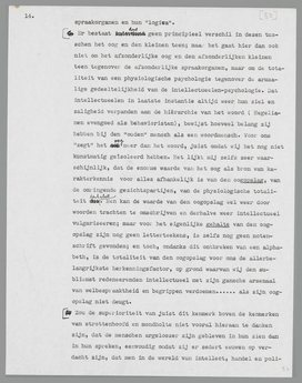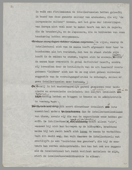 ‘Intellectueel’ is, als zooveel andere woorden, een term geworden, die meer verbergt dan onthult; hij vertolkt antipathie en sympathie tegelijk. Juist wij, die door de naïveteit der intellectueelen-hiërarchie en de ontaarding van in vakkundigheid afgestompte organen het meest worden gehinderd, noemen ons bij voorkeur zelf intellectueel, wanneer men ons vraagt, in welke atmosfeer wij thuis hooren: want wij wenschen geen beroep op een mystiek te voorschijn gegoocheld ‘volk’, wij wenschen geen nieuwe humbug in plaats van oude schijn-superioriteit. Daarom: de intellectueel is voor ons een paradox, zooals de vooruitgang voor ons een paradox is. Wij zijn afkeerig van den intellectueel, omdat hij door zijn hybris de wereld des geestes gecompromitteerd heeft, wij hebben hem