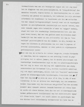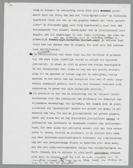 Welnu, ik kan met hetzelfde recht iemand, die mij naar mijn meening over de Evangeliën vraagt, antwoorden, dat zij mij even heerlijk gesmaakt hebben als Wiener Schnitzel: veel meer dan biefstuk is mij dat ‘rein Sprachliche’ niet waard. Het was hier de taal, die den intellectueel afstompte voor de paradoxale beteekenis van de figuur Nietzsche, zoowel als vertegenwoordiger van de intelligentie als van den vooruitgang. Deze ontaarding wordt niet gekenmerkt door het feit, dat men het ‘rein-Sprachliche’ in Nietzsche waardeert (want wie zou het op een gegeven moment niet zeer hoog waardeeren?), maar door dat veelzeggende ‘vor allem’. Duidelijker kon een intellectueel niet zeggen, dat hij zich niet wenscht in te laten met een probleem, dat geen litterair (in andere gevallen: philosophisch) probleem is; de schoone of wijze taal belet hem het denken over de dingen, die zich door middel van die taal manifesteeren.