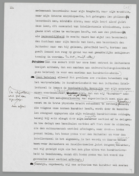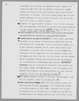 kannibalen en nog minder intellectueelen imponeeren. Onze man van karakter is iemand, die, onder deze ‘oude’ intellectueelen-hiërarchie, officieuze menschen imponeert door officieuze dingen, gehoorzamend aan een officieuzen ‘zin des levens’; zoo komt het, dat onze criteria van karakter alle criteria van den ‘ouden’ mensch kruisen; ‘karakter’ heeft met knapheid noch domheid, met vroomheid noch goddeloosheid, met vlijt noch met luiheid.... en met alle zes tegelijk te maken. En omdat deze zes ‘oude’ criteria alle verbonden zijn met het ‘geestelijk’ vooroordeel, kan men ook zeggen, dat ‘karakter’ voor ons eerder lichamelijk dan geestelijk is. Het is een herkenningsteeken, het laat zich raden uit de officieuze dingen van het lichaam, die de intellectueel hoogstens accepteert als ‘practische menschenkennis’. De intellectueel zoekt, nog steeds, zijn ware menschenkennis hoogerop....