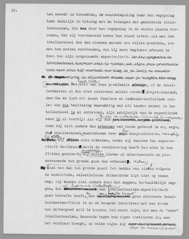 De wijze, waarop de intellectueel zich van de ‘massa’ heeft afgemaakt, terwijl hij haar tegelijk zijn wijsheden verkocht in den vorm van populariseerende brochures, was zeker alleszins paradoxaal; hij beschouwde haar als een voetstuk, dat hem in staat stelde zijn hoofd in denkbeeldige wolken te steken. Maar wat te doen, wanneer het voetstuk autonoom wordt, wanneer deze ‘massa’ het overwicht door het getal duidelijk gaat beseffen, wanneer zij bij monde van uit haarzelf voortgekomen ‘leiders’ aan de hiërarchische ordening der kennis van het intellectueelendom ontsnapt? Het zou kunnen zijn, dat er dan spoedig geen intellectueelen meer zouden bestaan, tenzij in het gareel gespannen voor technische en economische doeleinden. Men zal weliswaar het intellect ook in de toekomst noodig hebben om bruggen te bouwen en administratie te voeren; maar dit soort dienstbaar geworden intellect is iets essentieel anders dan de intellectueelenklasse van thans met haar hiërarchie, zooals wij die van de negentiende eeuw hebben geërfd. De intellectueel, zooals wij hem kennen, heeft alleen ‘zin’, wanneer hij zich beroepen kan op een hiërarchie, krachtens welke hij het recht heeft zich boven de ‘massa’ te verheffen. Dat recht is onchristelijk, maar als het wegvalt, dan valt daarmee de intellectueel; wat overblijft, is een ‘technicus des geestes’, die bij de monteurs kan worden ondergebracht. Met andere woorden: als de in-