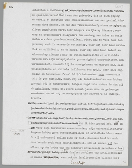 munt; maar de wetenschappelijke en artistieke parvenu met zijn metaphysische protsigheid compromitteert den werkmansstand, waaruit hij is voortgekomen, en waartoe hij, alle philosophische en ethische briljanten ten spijt, door oogopslag en handgebaar fataal blijft behooren. Onze universaliteit (‘honnêteté’, menschelijke waardigheid) is pas mogelijk, nádat wij ons, voor zoover wij tooneelcritici of mathematici zijn, hebben aangesloten bij de ambachtslieden; hetgeen nog iets anders is dan bij de arbeiders, omdat dit laatste woord sedert jaren door toedoen der geloovige marxisten ook al geurt naar de metaphysica der parvenu's.