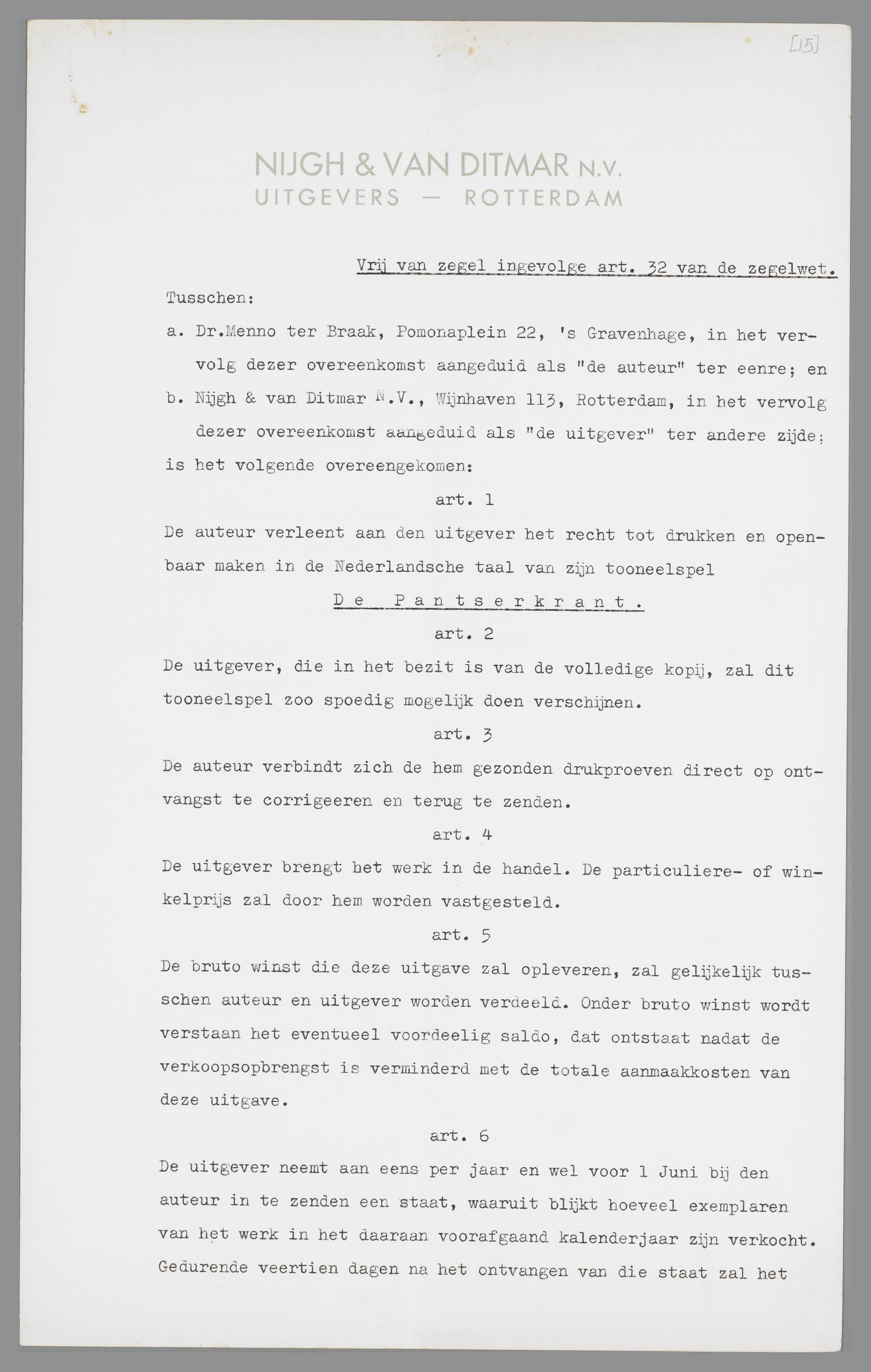 Contract met Nijgh & Van Ditmar, 1 februari 1935
