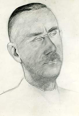 Illustratie rechts, afwisselend: Menno ter Braak en Thomas Mann op de trappen van het Mauritshuis in Den Haag | tekening van Thomas Mann door Paul Citroen