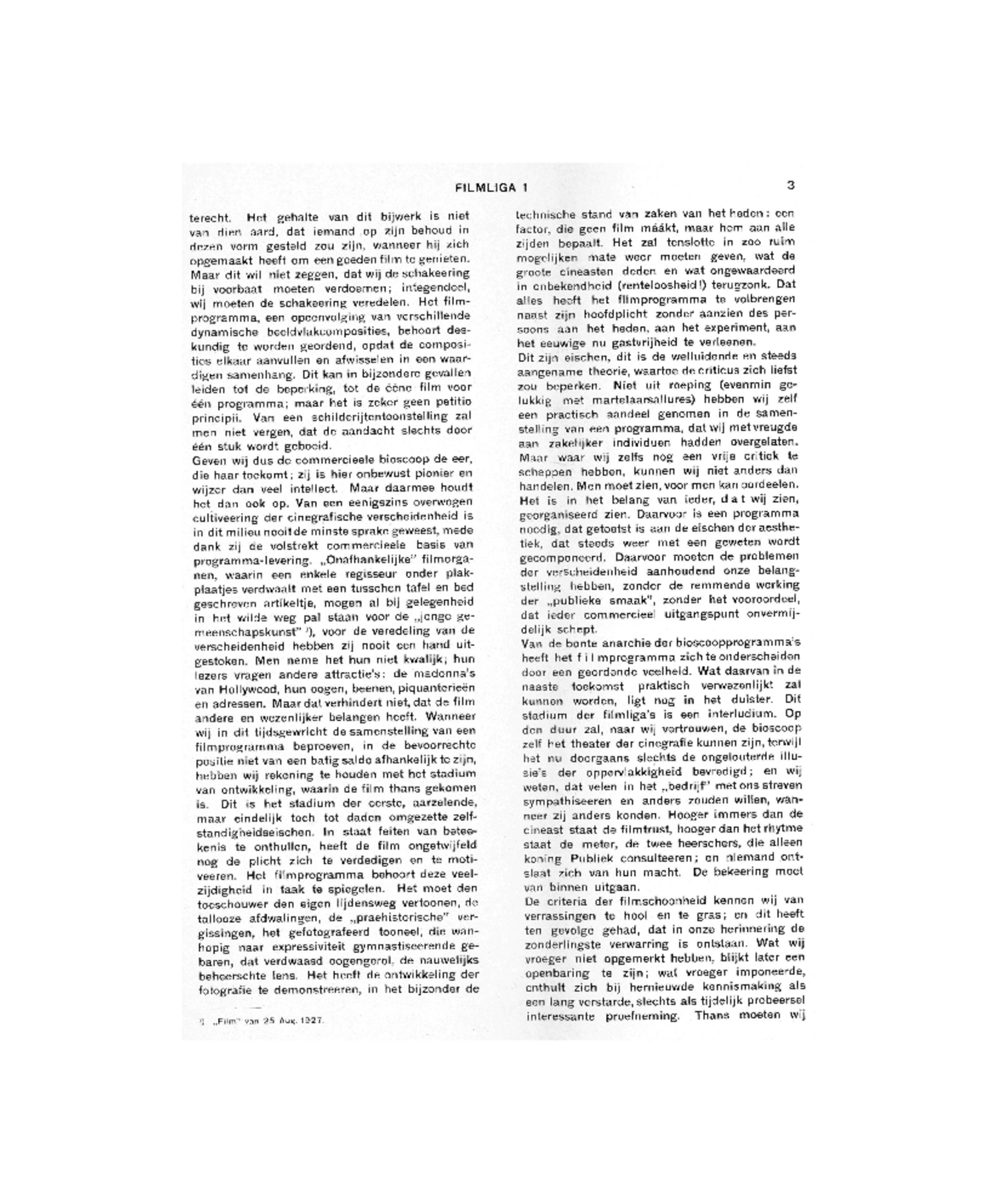 Van de bonte anarchie der bioscoopprogramma's heeft het filmprogramma zich te onderscheiden door een geordende veelheid. Wat daarvan in de naaste toekomst praktisch verwezenlijkt zal kunnen worden, ligt nog in het duister. Dit stadium der filmliga's is een interludium. Op den duur zal, naar wij vertrouwen, de bioscoop zelf het theater der cinegrafie kunnen zijn, terwijl het nu doorgaans slechts de ongelouterde illusie's der oppervlakkigheid bevredigd; en wij weten, dat velen in het ‘bedrijf’ met ons streven sympathiseeren en anders zouden willen, wanneer zij anders konden. Hooger immers dan de cineast staat de filmtrust, hooger dan het rhytme staat de meter, de twee heerschers, die alleen koning Publiek consulteeren; en niemand ontslaat zich van hun macht. De bekeering moet van binnen uitgaan.