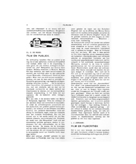 terecht. Het gehalte van dit bijwerk is niet van dien aard, dat iemand op zijn behoud in dezen vorm gesteld zou zijn, wanneer hij zich opgemaakt heeft om een goeden film te genieten. Maar dit wil niet zeggen, dat wij de schakeering bij voorbaat moeten verdoemen; integendeel, wij moeten de schakeering veredelen. Het filmprogramma, een opeenvolging van verschillende dynamische beeldvlakcomposities, behoort deskundig te worden geordend, opdat de composities elkaar aanvullen en afwisselen in een waardigen samenhang. Dit kan in bijzondere gevallen leiden tot de beperking, tot de ééne film voor één programma; maar het is zeker geen petitio principii. Van een schilderijtentoonstelling zal men niet vergen, dat de aandacht slechts door één stuk wordt geboeid.