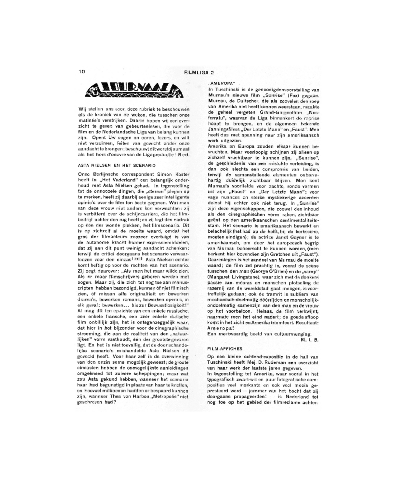 In Tuschinski is de genoodigdenvoorstelling van Murnau's nieuwe film ‘Sunrise’ (Fox) gegaan. Murnau, de Duitscher, die als zoovelen den roep van Amerika niet heeft kunnen weerstaan, maakte de geheel vergeten Grand-Guignolfilm ‘Nosferratu’, waarvan de Liga binnenkort de reprise hoopt te brengen, en de algemeen bekende Janningsfilms ‘Der Letzte Mann’ en ‘Faust’. Men heeft dus met spanning naar zijn amerikaansch werk uitgezien.