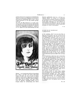 Onze Berlijnsche correspondent Simon Koster heeft in ‘Het Vaderland’ een belangrijk onderhoud met Asta Nielsen gehad. In tegenstelling tot de onnoozele dingen, die ‘sterren’ plegen op te merken, heeft zij daarbij eenige zeer intelligente opinie's over de film ten beste gegeven. Wat men van deze vrouw niet anders kon verwachten: zij is verbitterd over de schijncarrière, die het filmbedrijf achter den rug heeft; en zij legt den nadruk op één der wonde plekken, het filmscenario. Dit is op zichzelf al de moeite waard, omdat het gros der filmacteurs zoozeer overtuigd is van de autonome kracht hunner expressiemiddelen, dat zij aan dit punt weinig aandacht schenken; terwijl de critici doorgaans het scenario verwaarloozen voor den cineast zelf. Asta Nielsen echter komt heftig op voor de rechten van het scenario. Zij zegt daarover: ‘Als men het maar wilde zien. Als er maar filmschrijvers geboren werden met oogen. Maar zij, die zich tot nog toe aan manuscripten hebben bezondigd, kunnen òf niet filmisch zien, òf missen alle originaliteit en bewerken drama's, bewerken romans, bewerken opera's, in elk geval: bewerken...bis zur Bewusstlosigkeit!’ Al mag dit ten opzichte van een enkele russische, een enkele fransche, een zéér enkele duitsche film onbillijk zijn, het is ontegenzeggelijk waar, dat hier in het bijzonder voor de cinegraphische strooming, die aan de realiteit van den ‘natuurlijken’ vorm vasthoudt, één der grootste gevaren ligt. En het is niet toevallig, dat de door schandelijke scenario's mishandelde Asta Nielsen dit gevoeld heeft. Voor haar zelf is de overwinning van den onzin soms mogelijk geweest; de groote cineasten hebben de onmogelijkste aanleidingen omgekneed tot zuivere scheppingen; maar wat zou Asta gekund hebben, wanneer het scenario haar had begunstigd in plaats van haar te knellen, en hoeveel millioenen hadden er bespaard kunnen zijn, wanneer Thea von Harbou ‘Metropolis’ niet geschreven had?